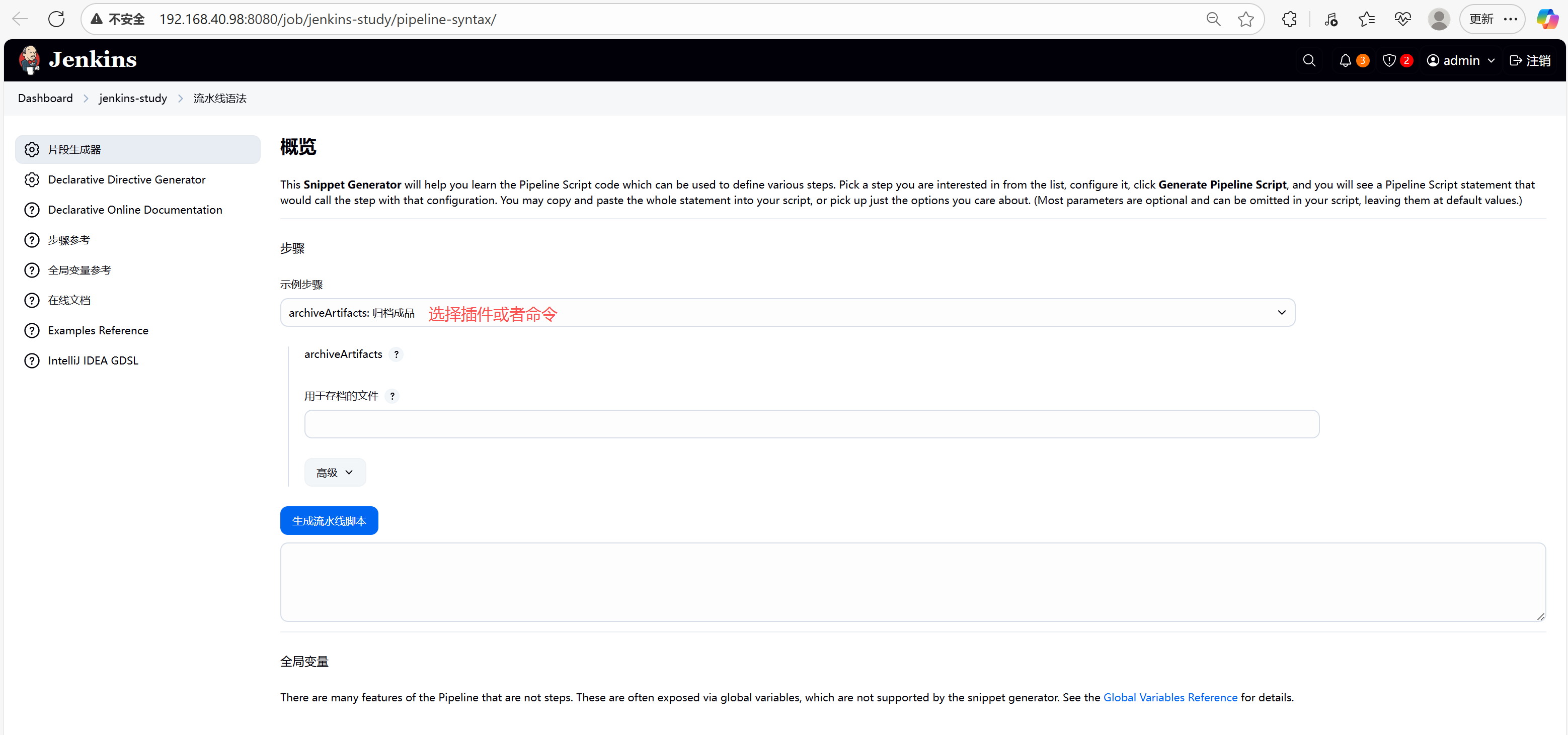 在流水线语法 Tab 页,选择插件或者命令,可以帮助我们以配置的方式,来生成流水线脚本。