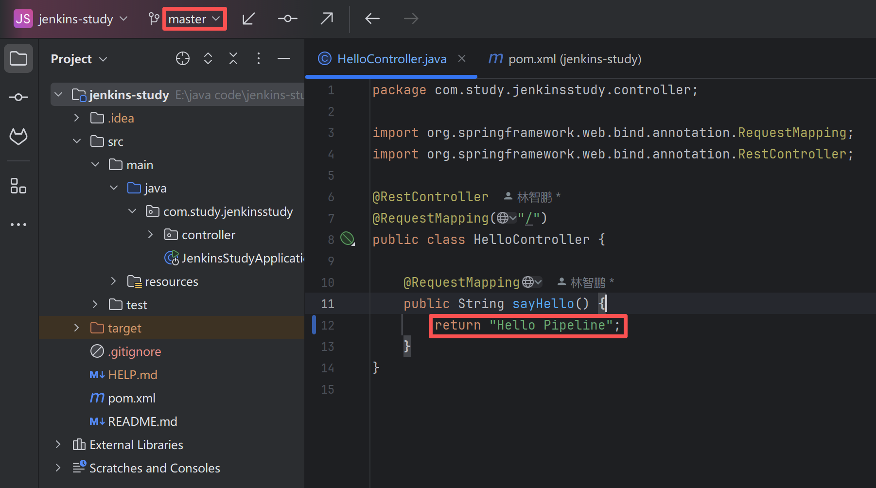 修改本地代码,提交到 master 分支,使用流水线重新构建。