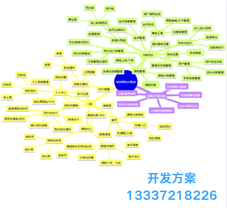 一个小程序应该具备的核心功能模块,并按照用户端(学员/家长) 和管理端(机构/老师) 两个维度进行阐述。