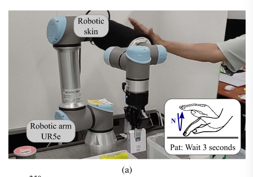 把皮肤装在 UR5e 机械臂的圆柱关节上(30 个 EMNs,密度 406 个 /m²),让机械臂 “边干活边响应触摸”: