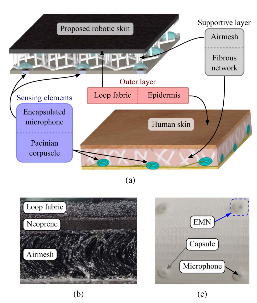 环层小体的特点是 “深、少、灵”—— 在皮肤深处,数量少,但对 20-1000Hz 的高频振动敏感。作者用 “封装麦克风” 模仿它(图 2 (c)):
