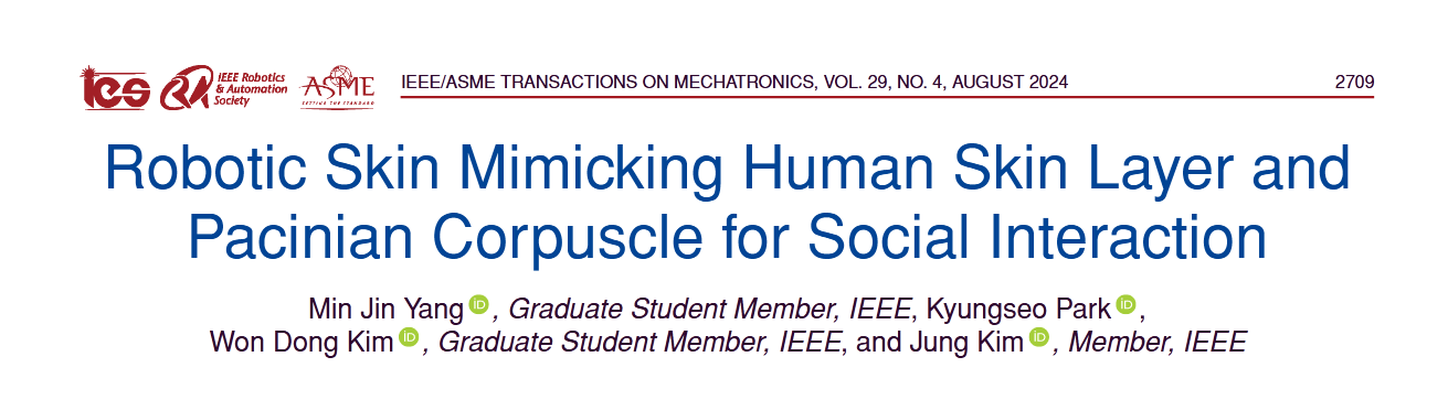 这篇文章来自 2024 年 8 月的《IEEE/ASME Transactions on Mechatronics》(机电领域顶刊),作者团队同样来自韩国 KAIST 和 DGIST。核心是解决 “机器人皮肤难以理解‘社交触觉’” 的问题 —— 让机器人像人一样,通过触摸的 “位置”(比如拍背、打脸)和 “方式”(比如轻拍、敲击),读懂人的情绪或意图(鼓励、不满),而实现这一目标的关键是模仿人类皮肤的结构和环层小体(Pacinian Corpuscle)的感知功能。