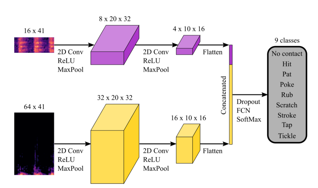 人类能区分 “轻拍” 和 “敲击”,靠的是触摸的 “时空特征”(比如轻拍快且弱,敲击重且慢)。作者用 CNN 提取这些特征,分 9 类(8 种社交触摸 + 无接触):