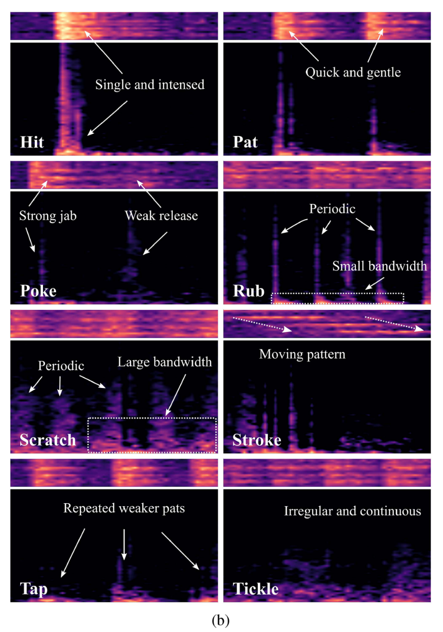 8 种触摸方式的特征很清晰:比如 “敲击(Hit)” 强度大、带宽窄;“挠痒(Tickle)” 强度弱、频率不规则。