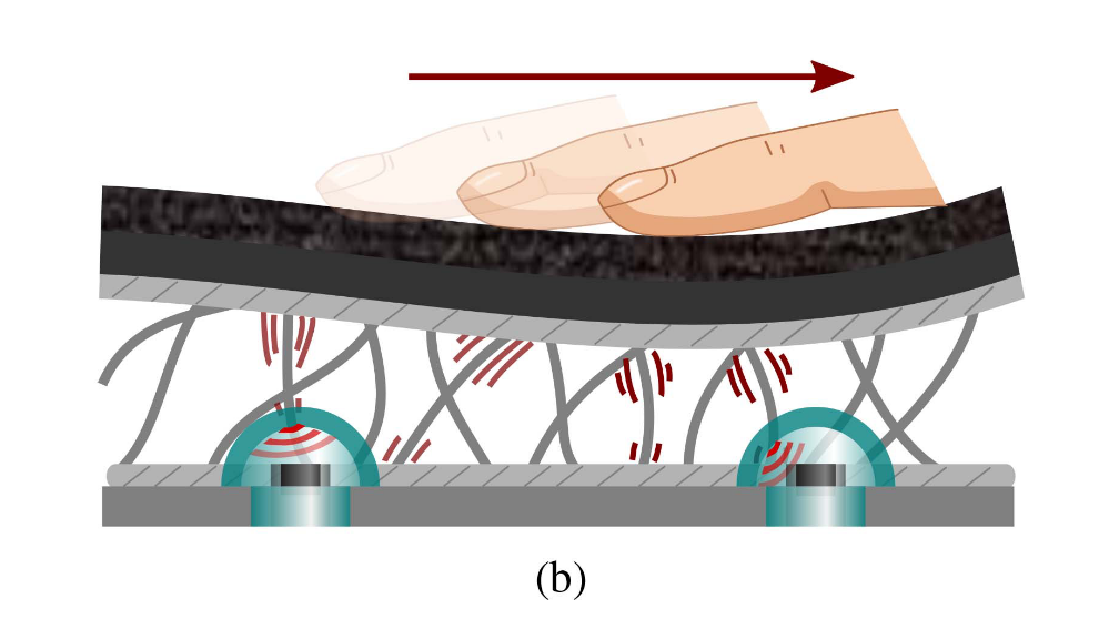 人类皮肤的表皮负责 “接触编码”(比如毛发感知轻触),真皮负责 “分散刺激 + 提供弹性”(比如按压后能回弹)。作者用三层织物实现这些功能(图 2 (b)):