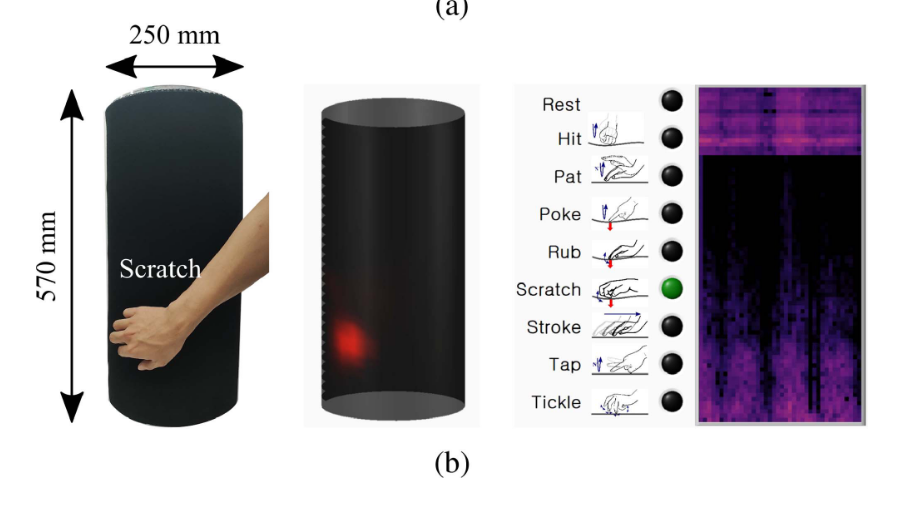 - 演示效果(图 13 (b)):能实时定位触摸位置(显示轨迹)、分类触摸方式(比如轻拍、挠痒);