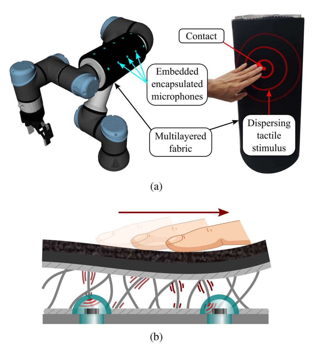 - 再结合算法(被动声学层析成像 + CNN),让少量传感节点就能定位触摸位置、分类触摸方式(图 1:左图是装在机械臂上的皮肤,右图是触觉感知原理 —— 触摸通过织物分散到 EMNs)。