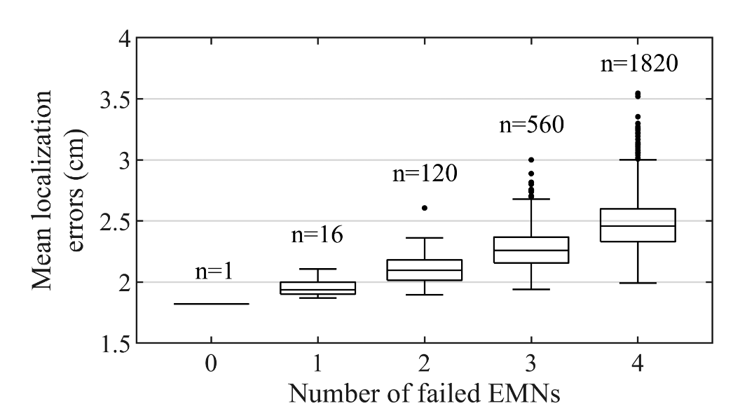 机器人皮肤难免碰撞,EMNs 可能坏。作者模拟 “EMN 失效”(故意让 1-4 个 EMN 无信号),看定位误差变化(图 8):