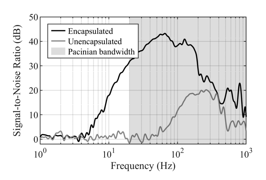 环层小体的核心能力是 “感知 20-1000Hz 的高频振动”。作者对比 “封装” 和 “未封装” 麦克风的频率响应(图 7):
