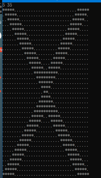 #define M 100char pattern[M][M+1];void generateSymmetricPattern(int m, int n) {int totalSize = n + m - 1;int center = totalSize / 2;// 初始化所有点为'.'for(int i = 0; i < totalSize; i++) {for(int j = 0; j < totalSize; j++) {pattern[i][j] = '.';}}// 只计算第一象限,然后对称到其他三个象限for(int i = 0; i <= center; i++) {for(int j = i; j < i + m && j <= center; j++) {// 在第一象限放置'*'pattern[i][j] = '*';// 对称到其他三个象限pattern[i][totalSize - 1 - j] = '*';           // 第二象限pattern[totalSize - 2 - i][j] = '*';           // 第四象限pattern[totalSize - 2 - i][totalSize - 1 - j] = '*'; // 第三象限}}