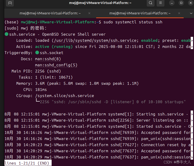 安装完成后会自动启动SSH服务,可以通过下面的命令来检查一下: