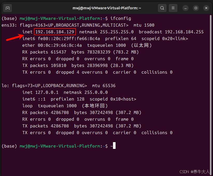 # 找到 ens33 或类似网卡的 inet 地址,如 192.168.1.105第一个ip地址就是要连接的ip
