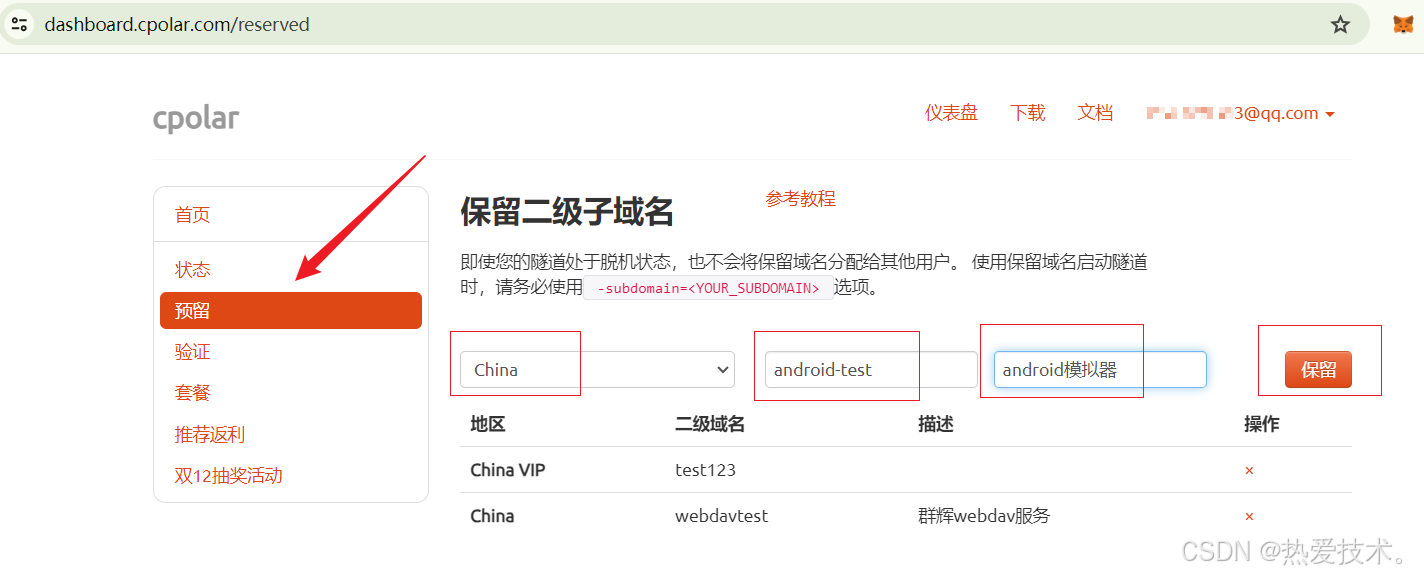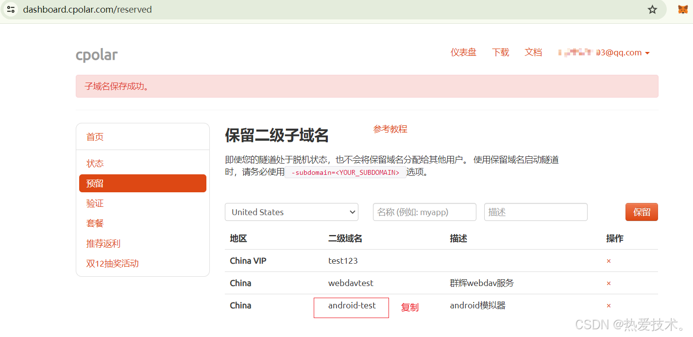 [登录cpolar官网](https://dashboard.cpolar.com/),点击左侧的预留,选择保留二级子域名,设置一个二级子域名名称,点击保留,保留成功后复制保留的二级子域名名称