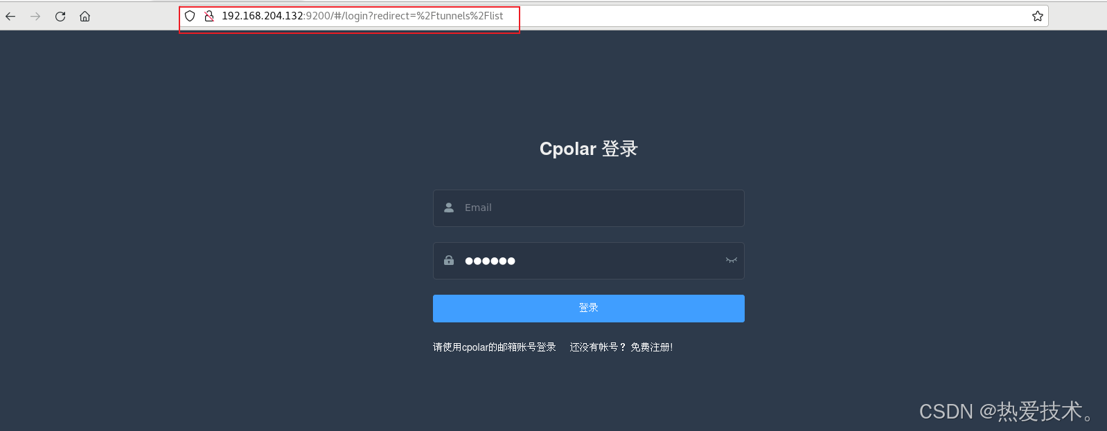 ```shell# 加入系统服务设置开机启动sudo systemctl enable cpolar# 启动cpolar服务sudo systemctl start cpolar# 重启cpolar服务sudo systemctl restart cpolar# 查看cpolar服务状态sudo systemctl status cpolar# 停止cpolar服务sudo systemctl stop cpolar```Cpolar安装和成功启动服务后,内部或外部浏览器上通过局域网IP加9200端口即:【http://192.168.xxx.xxx:9200】访问Cpolar管理界面,使用Cpolar官网注册的账号登录,登录后即可看到cpolar web 配置界面,接下来在web 界面配置即可