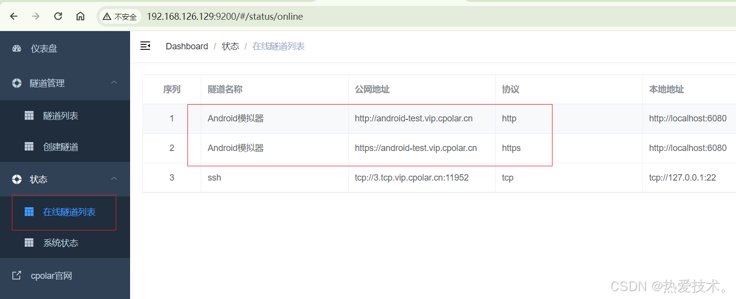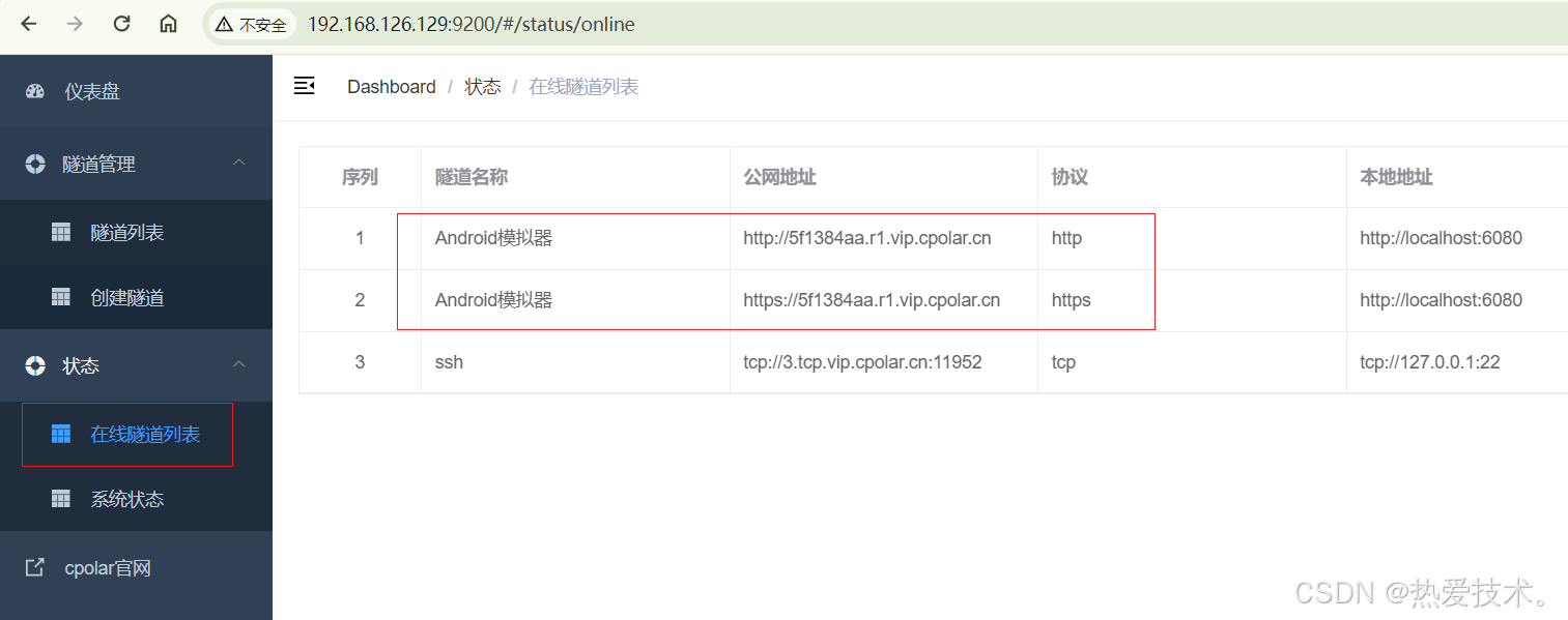 隧道创建成功后,点击左侧的状态——在线隧道列表,查看所生成的公网访问地址,有两种访问方式,一种是http 和https,两种都可以访问,下面选择其中一种进行远程访问