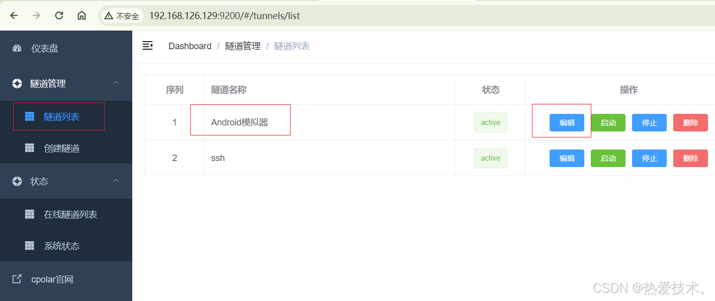 返回登录cpolar web UI管理界面,点击左侧仪表盘的隧道管理——隧道列表,找到所要配置的隧道,点击右侧的编辑