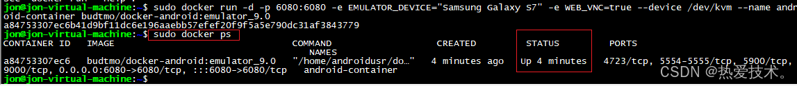 ```shelldocker run -d -p 6080:6080 -e EMULATOR_DEVICE="Samsung Galaxy S7" -e WEB_VNC=true --device /dev/kvm --name android-container budtmo/docker-android:emulator_9.0```运行后,输入sudo docker ps 可以看到运行的容器,UP状态表示正常