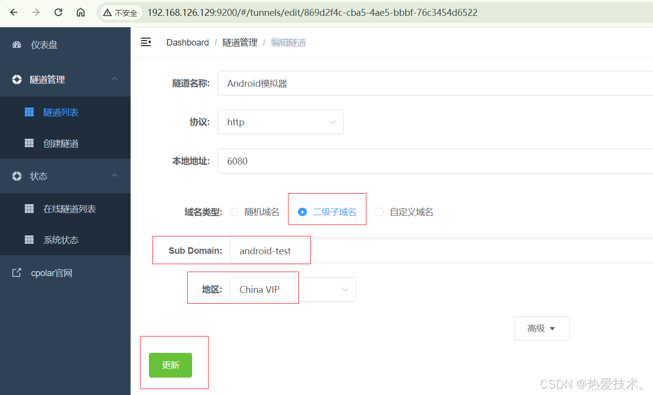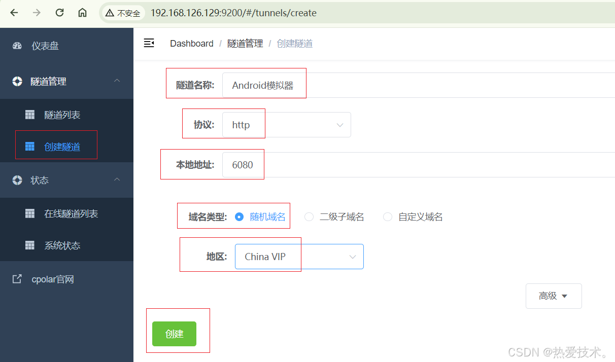 点击左侧仪表盘的隧道管理——创建隧道,创建一个android 模拟器的公网http地址隧道!