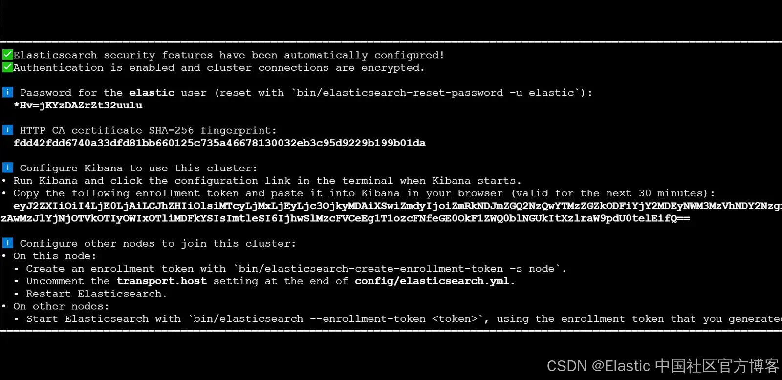 ./bin/elasticsearch第一次运行 Elasticsearch 时,它会生成安全证书和凭据。请务必保存这些信息以备将来使用。