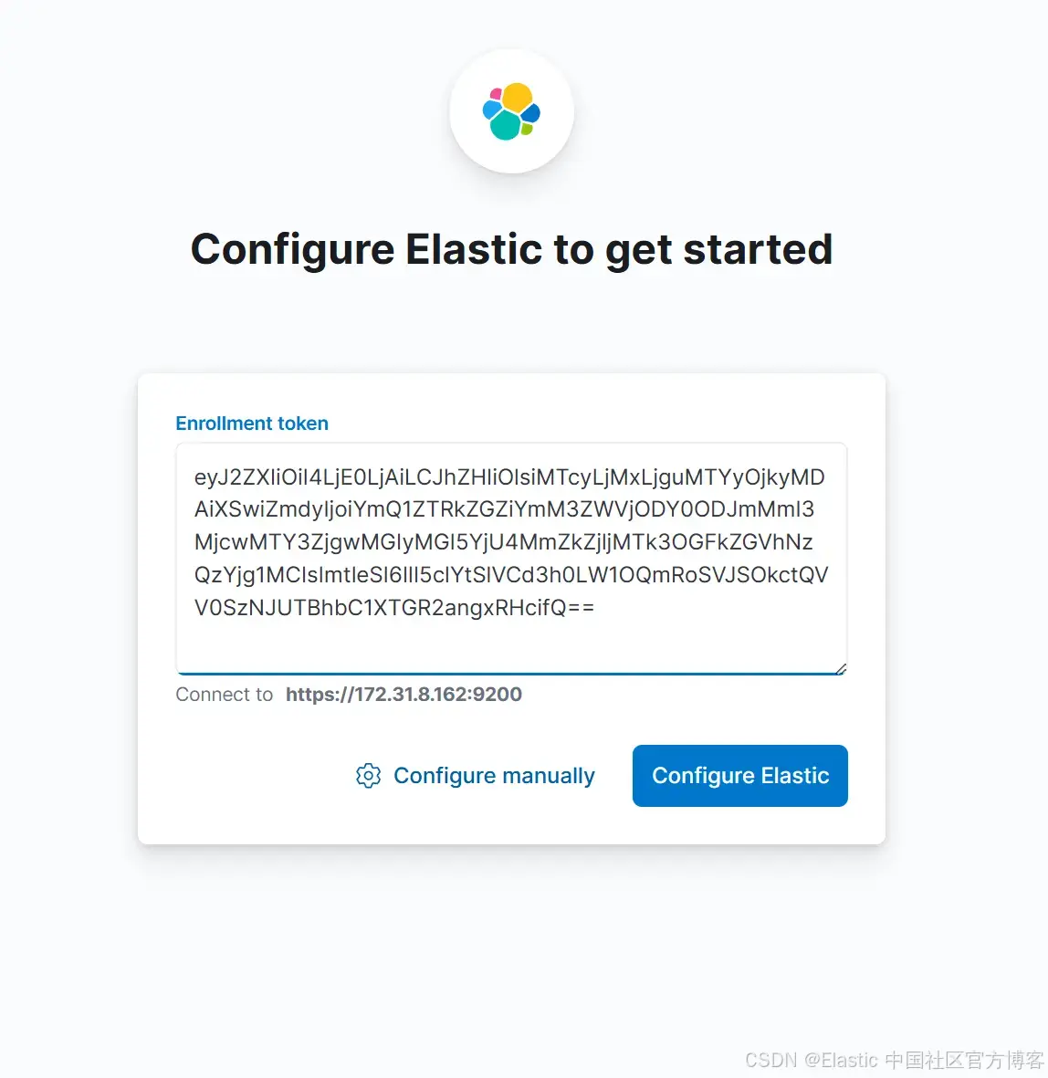 5)在提示时粘贴第 3 步的 Kibana 注册令牌 (enrollment token)