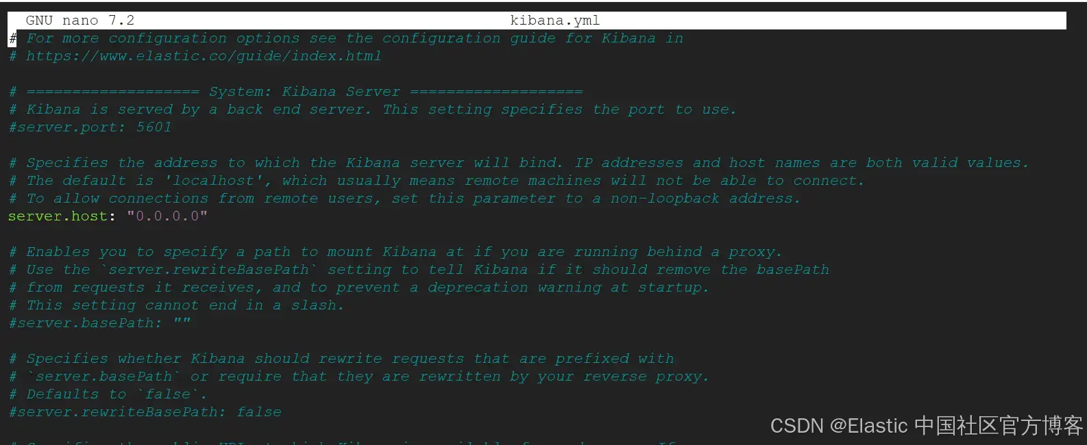 nano ./config/kibana.yml找到 server.host 设置,并将其配置为: