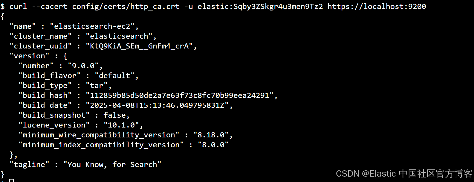 curl --cacert config/certs/http_ca.crt -u elastic:$ELASTIC_PASSWORD https://localhost:9200将 $ELASTIC_PASSWORD 替换为第 3 步生成的密码。