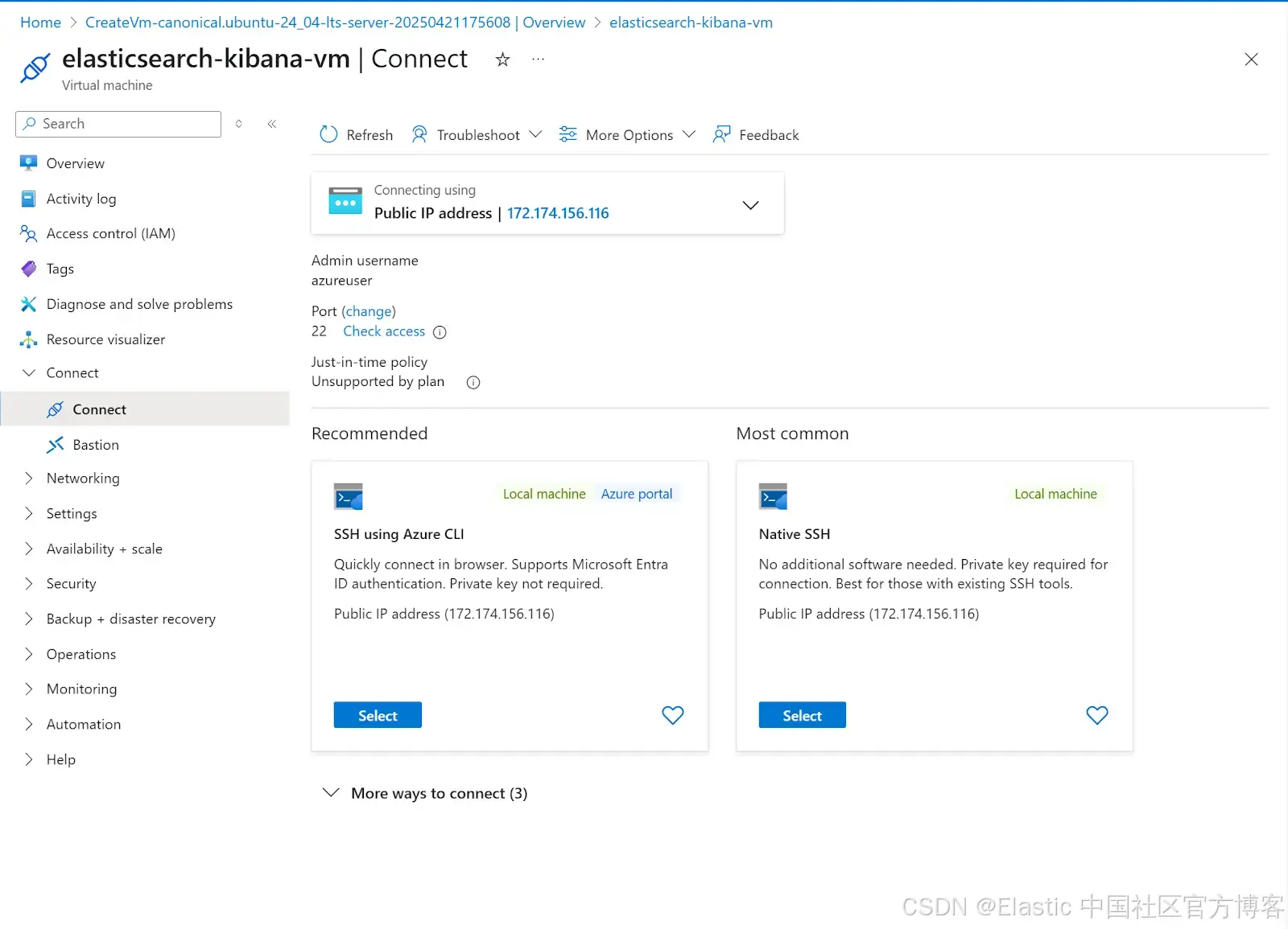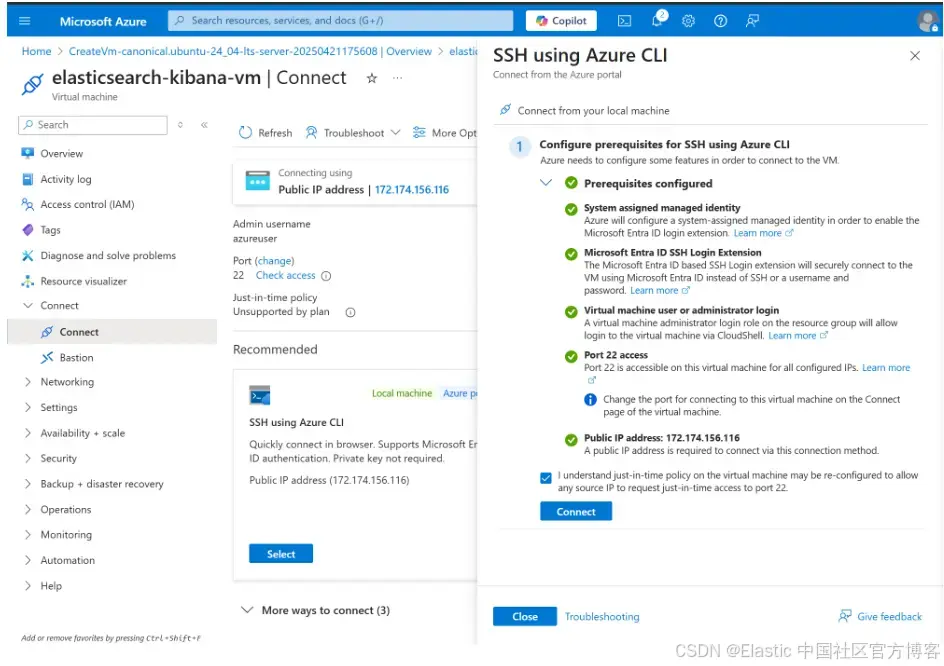 16)在这里,你可以通过 SSH 连接到实例的公共 IP 地址,或者直接从 Azure UI 连接。