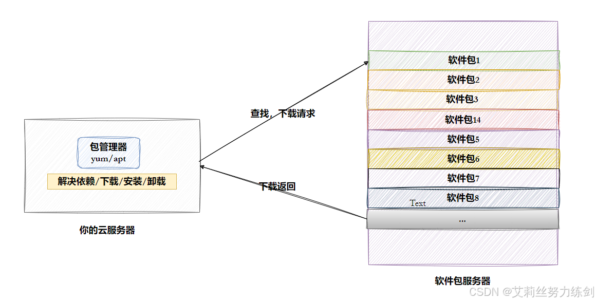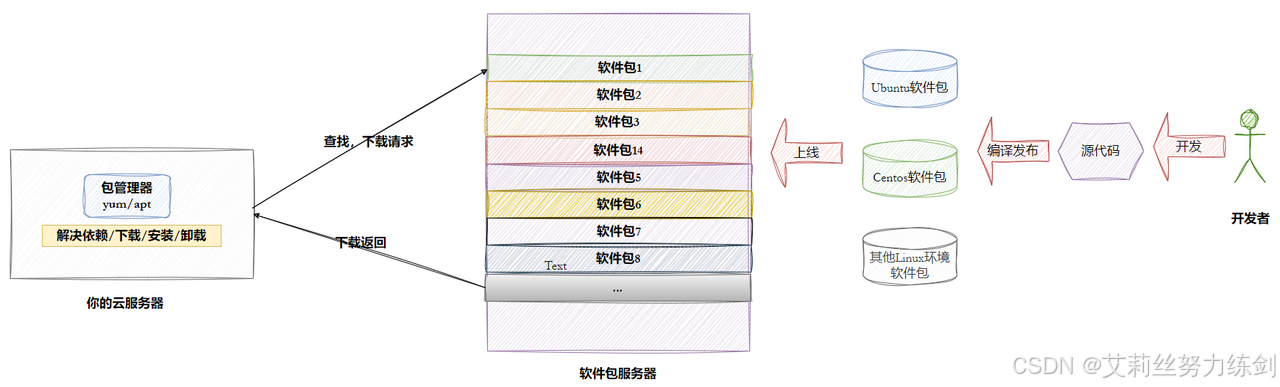 2、但是这样太麻烦了,于是有些人把一些常用的软件提前编译好,做成软件包(可以理解成windows上的安装程序)放在一个服务器上,通过包管理器可以很方便的获取到这个编译好的软件包,直接进行安装;
