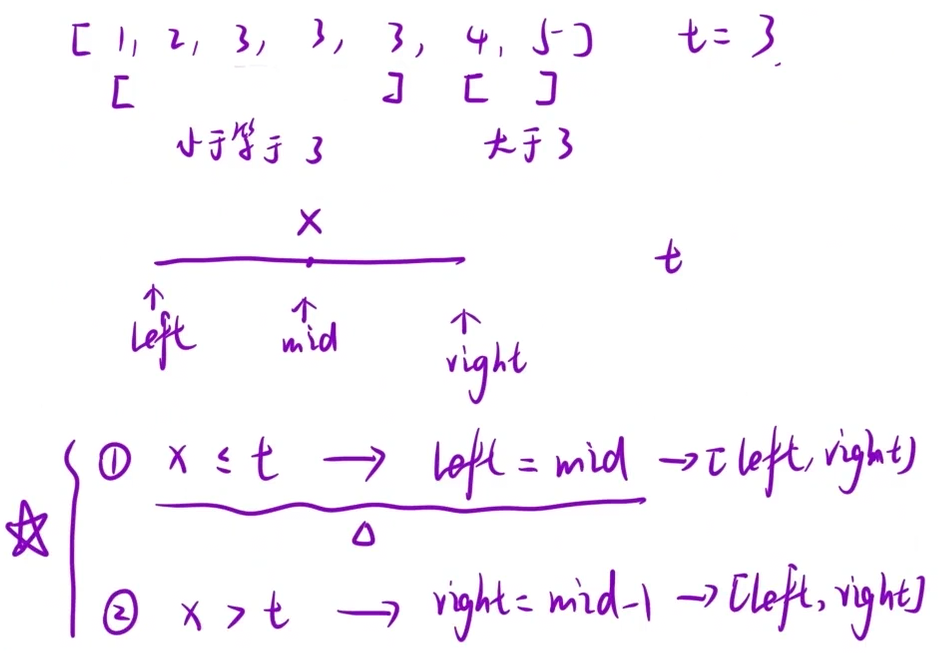 查找右区间端点 x<=t的时候 为什么是left=mid?