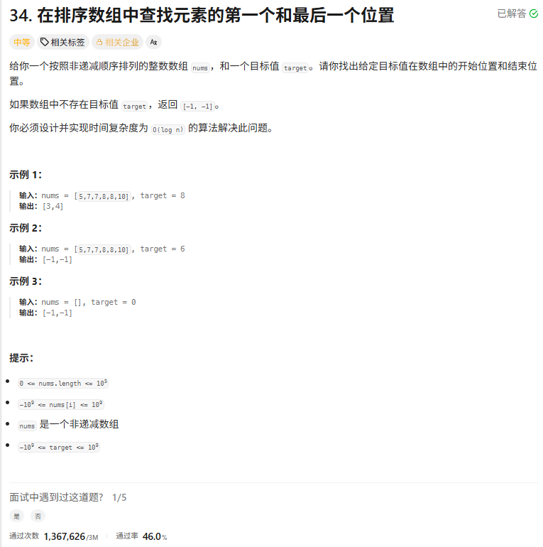 class Solution {public int[] searchRange(int[] nums, int target) {//处理边界情况int[] ret = new int[2];ret[0] = ret[1] = -1;if(nums.length == 0 )  return ret;//1.二分左端点int left = 0 , right = nums.length-1;while(left<right){int mid = left+(right-left)/2;if(nums[mid]<target) left = mid +1;else right = mid;}//因为这个数组有可能有没有target  所以需要判断一下//判断是否有结果if(nums[left] != target) return ret;else ret[0]=right;//2.二分右面端点left = 0 ;right = nums.length-1;//因为已经找到区间的左端点 不需要从0开始 我们此时可以从左端点开始while(left<right){int mid = left+(right-left+1)/2;if(nums[mid]<=target) left = mid;else right = mid-1;}ret[1]=left;return ret;}