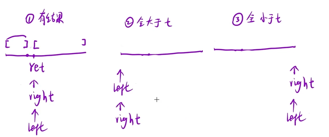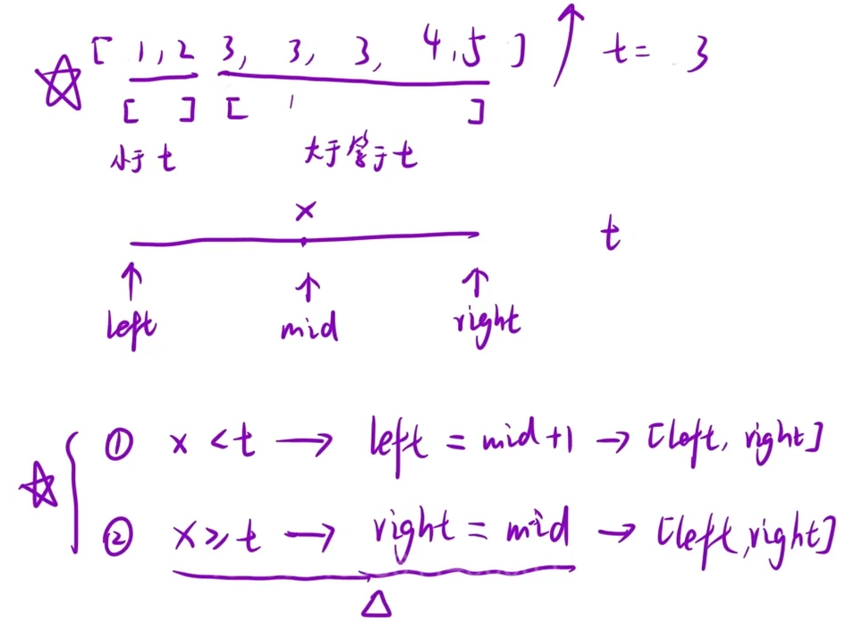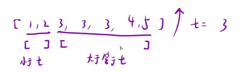 找到的这个元素小于t可以确保左面那个区间扔了 然后left移动到mid+1