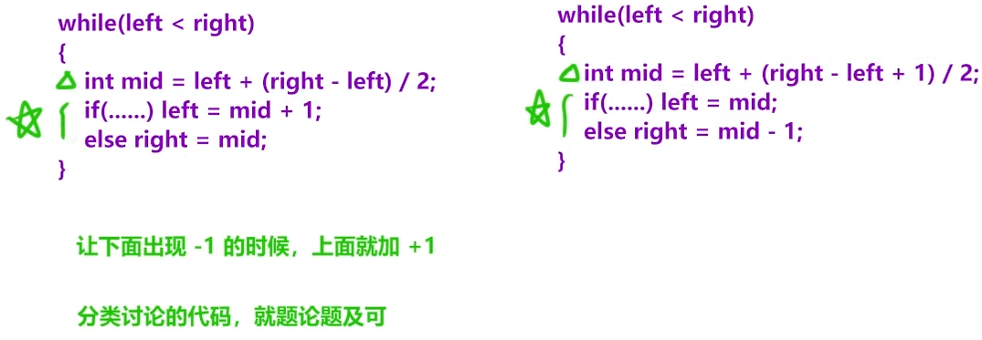 mid落在的区间一定是不符合要求的(就像是查找左区间 left一定想要跳出来 那个区间就没有 这里也一样 right也一直想要跳出这个区间 因为这个区间没有要找的点)