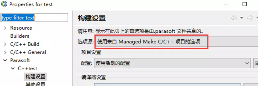 项目右键->属性(properties)->Parasoft->C++Test->构建设置->选项源->使用来自构建数据文件(bdf)的选项->设置bdf文件路径(如果生成在项目路径下比较方便)->编译器设置->点击自动检测(如果没有检测出请点击左侧的下拉菜单选择ARM compiler5.0)->C、C++、连接器都输入全路径。