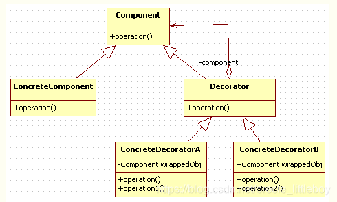 Decorator(抽象装饰器):持有一个Component对象的引用,并实现Component接口。它是所有具体装饰器的父类。