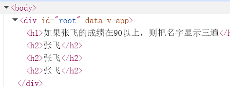 <div id="root"><h1>如果张飞的成绩在90以上,则把名字显示三遍</h1><template v-if="score >= 90"><h2>{{ name }}</h2><h2>{{ name }}</h2><h2>{{ name }}</h2></template>