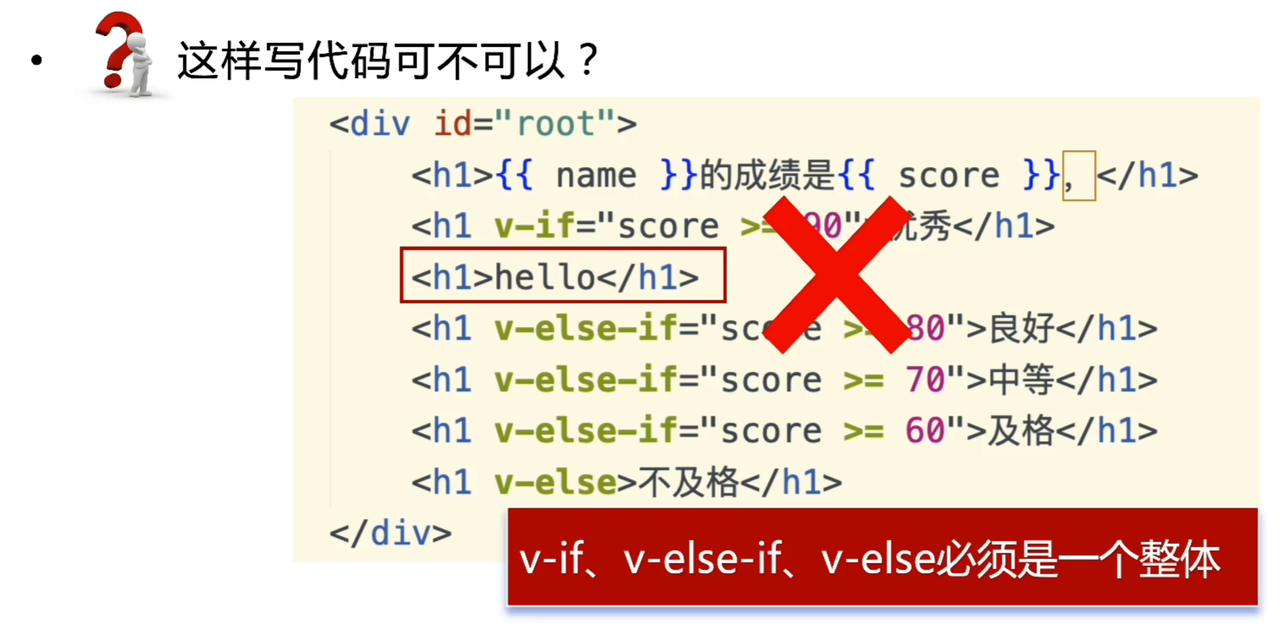 <div id="root"><h1>如果张飞的成绩在90以上,则把名字显示三遍</h1><div v-if="score >= 90"><h2>{{ name }}</h2><h2>{{ name }}</h2><h2>{{ name }}</h2></div>