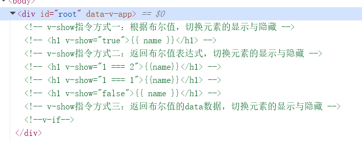首先将之前的例子进行改造,可以发现两者作用都是差不多的;相比v-show,也没有出现在了真实的DOM结构当中。