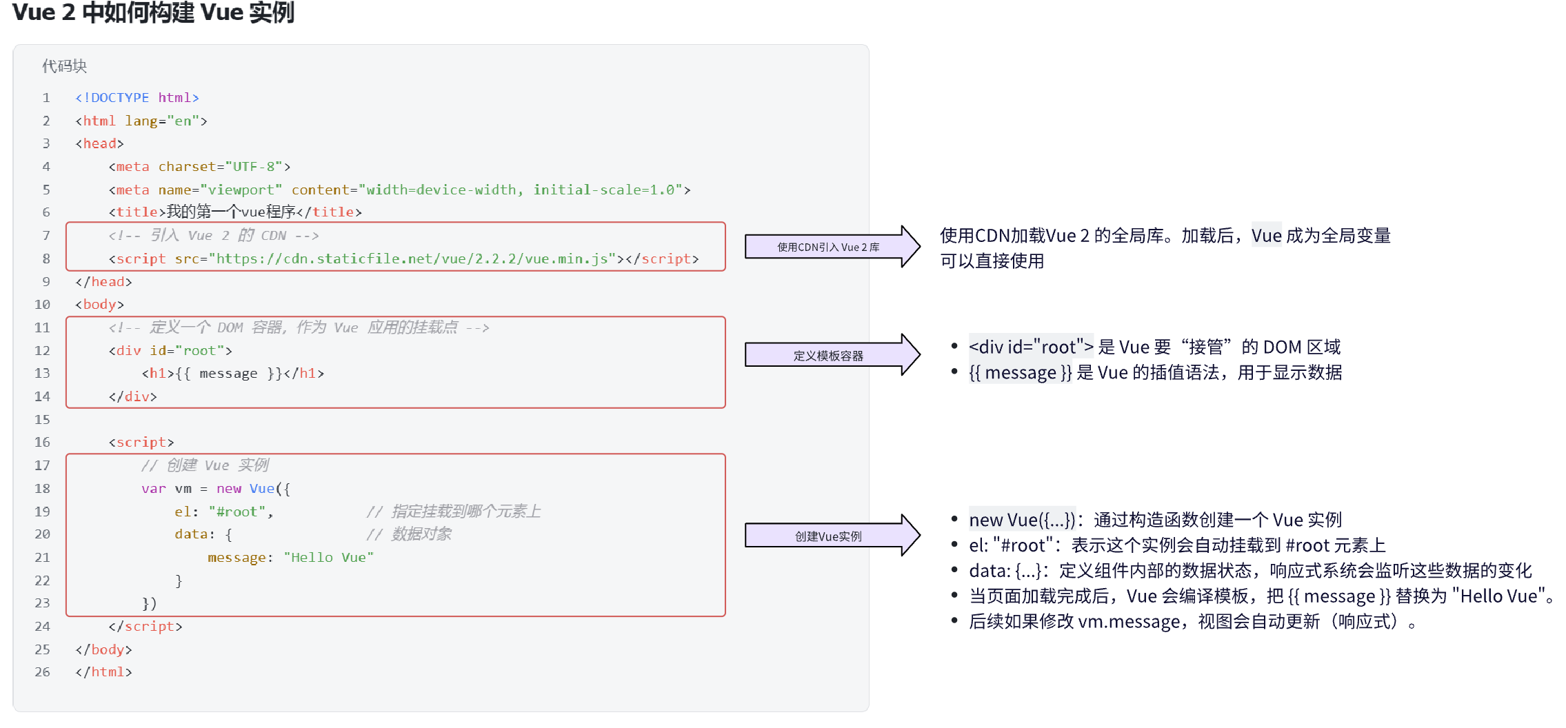 <body><!-- 定义一个 DOM 容器,作为 Vue 应用的挂载点 --><div id="root"><h1>{{ message }}</h1></div><script>// 创建 Vue 实例var vm = new Vue({el: "#root",           // 指定挂载到哪个元素上data: {                // 数据对象message: "Hello Vue"}})</script>