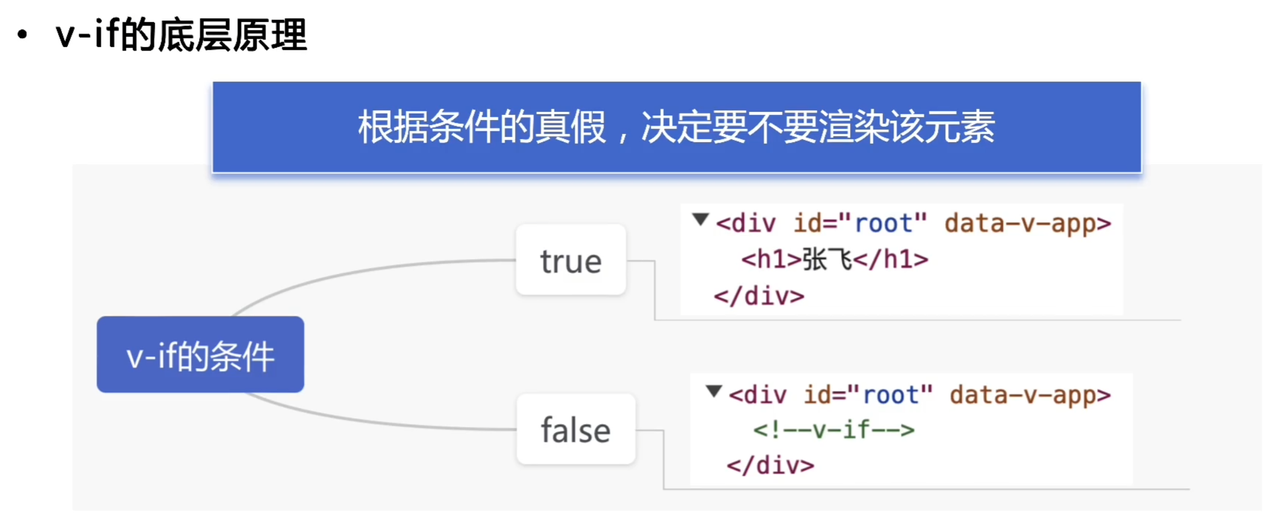 v-if 的底层原理是:调用 addIfCondition 方法,生成 vnode 时会忽略对应节点,render 时就不会渲染。简要来说就是根据条件的真假,决定要不要渲染这个元素。