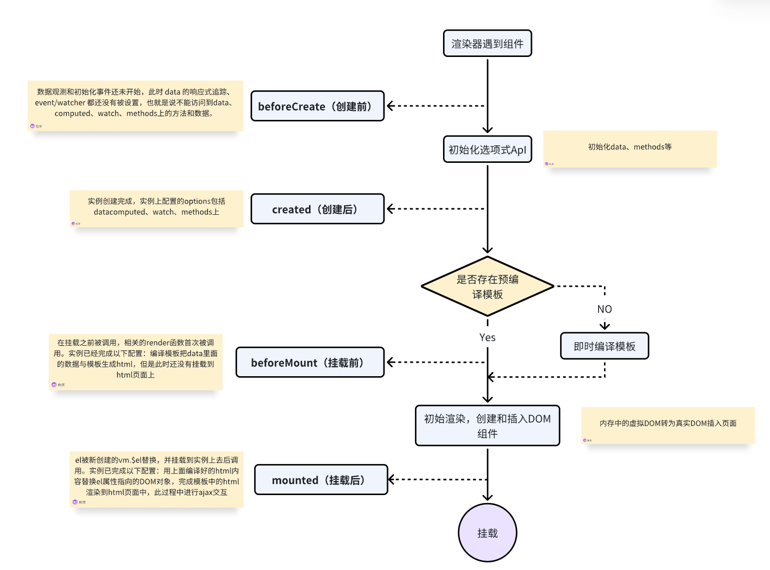 | 挂载阶段 | beforeMount: 页面中的DOM未经过Vue编译 mounted: 页面中的DOM经过Vue编译;将虚拟DOM转为真实DOM插入页面 |