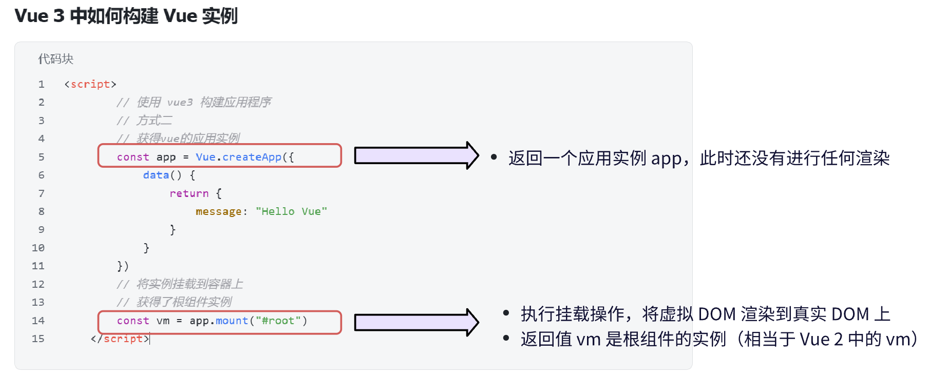 <script>// 使用 vue3 构建应用程序// 方式二// 获得vue的应用实例const app = Vue.createApp({data() {return {message: "Hello Vue"}}})// 将实例挂载到容器上// 获得了根组件实例const vm = app.mount("#root")
