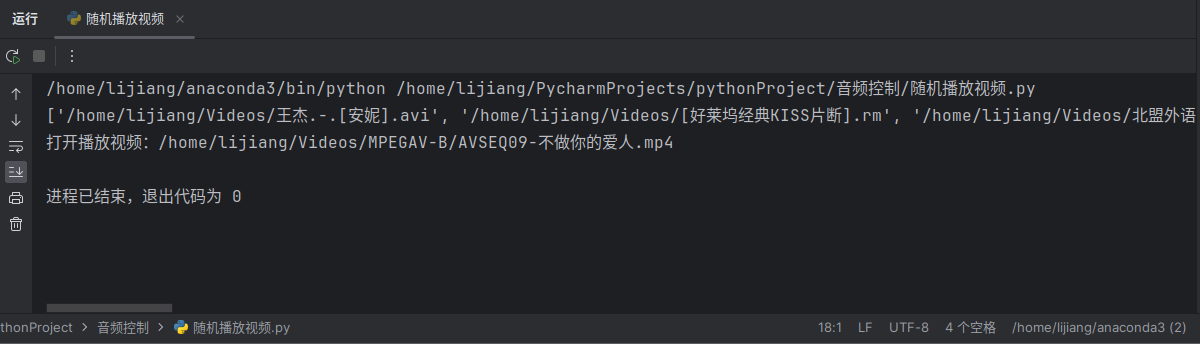 import subprocessvideo_type = ['avi', 'mp4', 'rm', 'rmvb', 'VOB']def random_walk(root_dir):all_videos = []for root, dirs, files in os.walk(root_dir):for file in files:extract_str = file.split('.')[-1].lower()if extract_str in video_type:all_videos.append(os.path.join(root, file))return all_videosif __name__ == '__main__':all_videos = random_walk('/home/lijiang/Videos')print(all_videos)for i in range(random.randint(1, 5)):video = random.choice(all_videos)print('打开播放视频:' + video)subprocess.call(['open', video])