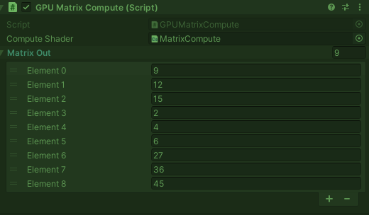 现在回到编辑器中,将脚本拖入任意物体中,并把ComputeShader也赋值上,点击运行就能看到MatrixOut所显示的输出结果了: