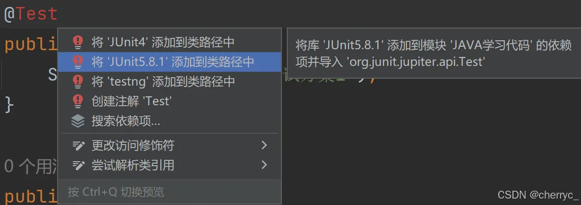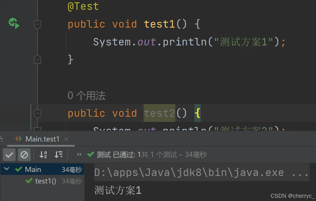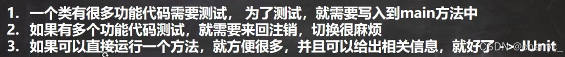 - 用@Test注解标注要测试的方法后,键入Alt+Enter,不用调用方法,直接可以运行
