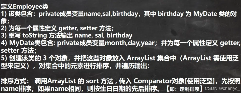 - 💻例题:  - import java.util.*;public class Main {public static void main(String[] args) {ArrayList<Employee> list = new ArrayList<>();list.add(new Employee("white", 45633, new MyDate(2002, 2, 3)));list.add(new Employee("andy", 36325, new MyDate(1980, 2, 3)));list.add(new Employee("andy", 62234, new MyDate(1987, 2, 3)));System.out.println(list);list.sort(new Comparator<Employee>() {@Overridepublic int compare(Employee o1, Employee o2) {// 先比较名字int res = o1.getName().compareTo(o2.getName());if (res != 0) {return res;}// 比较生日return o1.getBirthday().compareTo(o2.getBirthday());}});System.out.println(list);} }class Employee {private String name;private int sal;private MyDate birthday;public Employee(String name, int sal, MyDate birthday) {this.name = name;this.sal = sal;this.birthday = birthday;}public void setName(String name) {this.name = name;}public void setSal(int sal) {this.sal = sal;}public void setBirthday(MyDate birthday) {this.birthday = birthday;}public String getName() {return name;}public int getSal() {return sal;}public MyDate getBirthday() {return birthday;}@Overridepublic String toString() {return "Employee{" +"name='" + name + '\\'' +", sal=" + sal +", birthday=" + birthday +'}';} }class MyDate implements Comparable<MyDate>{private int year;private int month;private int day;public MyDate(int year, int month, int day) {this.year = year;this.month = month;this.day = day;}public void setYear(int year) {this.year = year;}public void setMonth(int month) {this.month = month;}public void setDay(int day) {this.day = day;}public int getYear() {return year;}public int getMonth() {return month;}public int getDay() {return day;}@Overridepublic String toString() {return "MyDate{" +"year=" + year +", month=" + month +", day=" + day +'}';}@Overridepublic int compareTo(MyDate o) {int res = this.year - o.getYear();if (res != 0) {return res;}res = this.month - o.getMonth();if (res != 0) {return res;}res = this.day - o.getDay();return res;} }- 输出结果: - [Employee{name='white', sal=45633, birthday=MyDate{year=2002, month=2, day=3}}, Employee{name='andy', sal=36325, birthday=MyDate{year=1980, month=2, day=3}}, Employee{name='andy', sal=62234, birthday=MyDate{year=1987, month=2, day=3}}] [Employee{name='andy', sal=36325, birthday=MyDate{year=1980, month=2, day=3}}, Employee{name='andy', sal=62234, birthday=MyDate{year=1987, month=2, day=3}}, Employee{name='white', sal=45633, birthday=MyDate{year=2002, month=2, day=3}}]