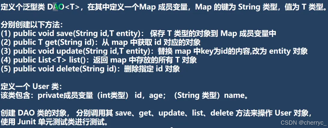 - 💻例题:  - import org.junit.jupiter.api.Test;import java.util.*;public class Main {public static void main(String[] args) {}@Testpublic void test() {DAO<User> dao = new DAO<>();dao.save("001", new User(1, 10, "jack"));dao.save("002", new User(2, 18, "king"));dao.save("003", new User(3, 38, "smith"));List<User> list = dao.list();System.out.println(list);} }class DAO<T> {public Map<String, T> map = new HashMap<>();public void save(String id, T entity) {map.put(id, entity);}public T get(String id) {return map.get(id);}public void update(String id, T entity) {map.put(id, entity);}// 遍历map,将所有value封装到ArrayList并返回public List<T> list() {ArrayList<T> v = new ArrayList<>();for (String key: map.keySet()) {v.add(map.get(key));}return v;}public void delete(String id) {map.remove(id);} }class User {private int id;private int age;private String name;public User(int id, int age, String name) {this.id = id;this.age = age;this.name = name;}public void setName(String name) {this.name = name;}public void setAge(int age) {this.age = age;}public void setId(int id) {this.id = id;}public String getName() {return name;}public int getAge() {return age;}public int getId() {return id;}@Overridepublic String toString() {return "User{" +"id=" + id +", age=" + age +", name='" + name + '\\'' +'}';} }- @Test方法通常不写成静态方法(- static)的原因主要有以下几点:- JUnit 的设计规范 - JUnit(包括 JUnit 5/Jupiter)默认要求测试方法是非静态的。这是因为测试框架通常需要实例化测试类,并在运行时调用测试方法。如果测试方法是静态的,JUnit 可能无法正确识别和执行它们。