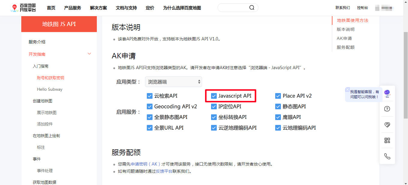 完成之后点击提交,这样就不会出现点击地铁站点,没有响应的情况出现。这里建议官网更新一下官方的授权说明文档,同时在不同的接口说明需要开通的服务,不然对新手理解会有一定难度。下图是官网地铁的授权说明: