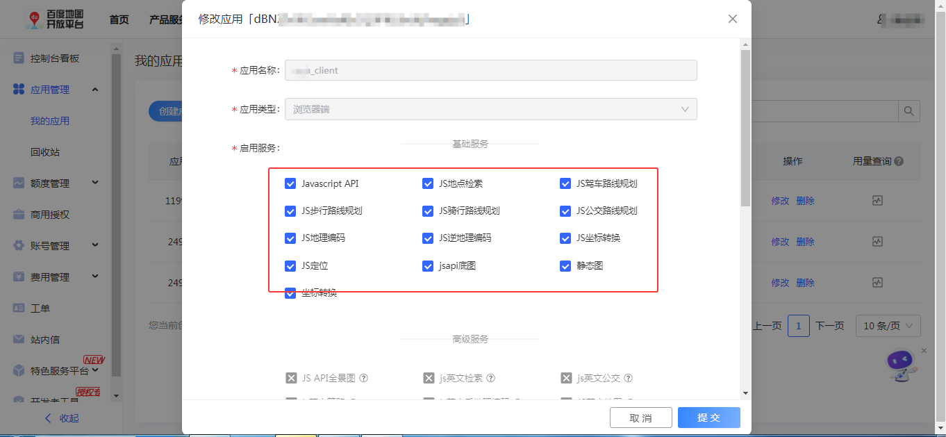 如果想要在地铁api中实现详情和出行路线的生成,那么在申请应用时一定要勾选相应的服务,否则就会出现点击之后系统无响应,同时页面也没有明确的报错信息出现。如果没有特别的限制,建议将所有的服务都开通,如下图所示: