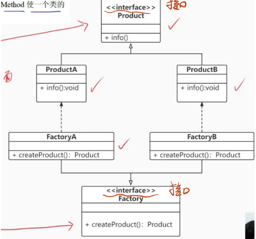 - 代码实现: public class FactoryMethod {public static void main(String[] args) {Factory factoryA = new FactoryA();// 父类 对象名 = new 子类();Product productA = factoryA.createProduct();// Product productA = new ProductA();productA.info();Factory factoryB = new FactoryB();Product productB = factoryB.createProduct();productB.info();} }// class Factory interface Factory {public Product createProduct(); }class FactoryA implements Factory {@Overridepublic Product createProduct() {return new ProductA();} }class FactoryB implements Factory {@Overridepublic Product createProduct() {return new ProductB();} }// abstract class Product interface Product {// public abstract void info();public void info(); }// class ProductA extends Product class ProductA implements Product {@Overridepublic void info() {System.out.println("产品的信息:A");} }// class ProductB extends Product class ProductB implements Product {@Overridepublic void info() {System.out.println("产品的信息:B");} }