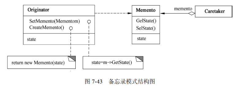 - 备忘录(Memento):存储原发器状态,对原发器外的对象不可见(仅原发器可访问其状态)。